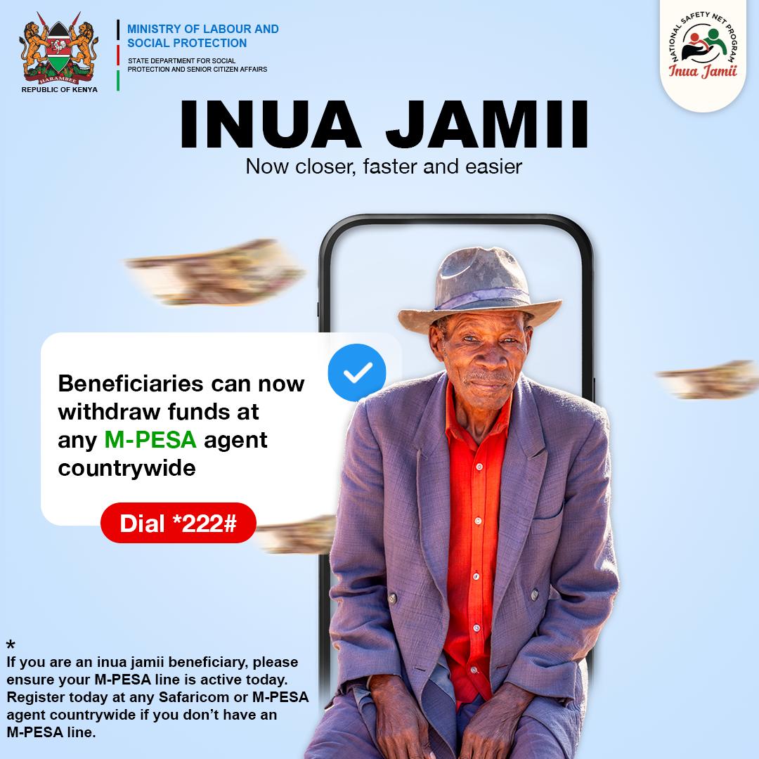"The government has adopted MPesa as the primary mode of disbursing funds under the Inua Jamii Programme to improve efficiency, accessibility, and security. Beneficiaries who do not have an active MPesa line are encouraged to register at any Safaricom or MPesa agent countrywide.