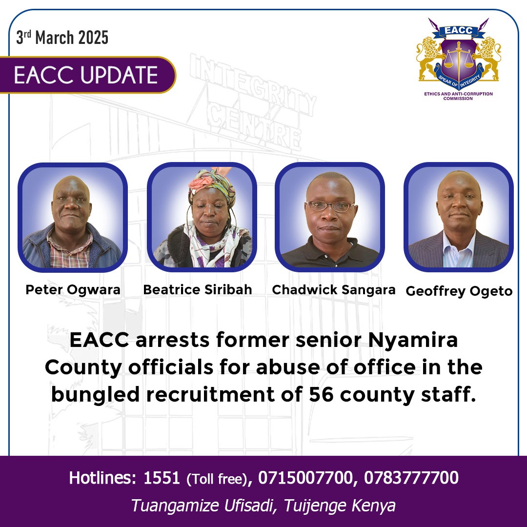 The Ethics and Anti-Corruption Commission (EACC) has arrested four former senior officials from Nyamira County over allegations of abuse of office in the recruitment and appointment of 56 county staff.