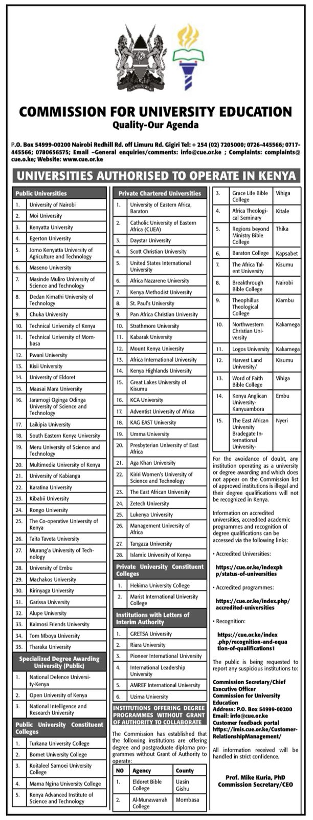 “For the avoidance of doubt, any institution operating as a university or degree awarding and which does not appear on the Commission list of approved institutions is illegal and their degree qualifications will not be recognized in Kenya,” CUE CEO Mike Kuria stated.