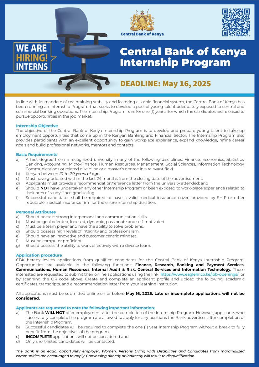The Central Bank of Kenya (CBK) is inviting applications for its 2025 Internship Program, with the deadline set for May 16.