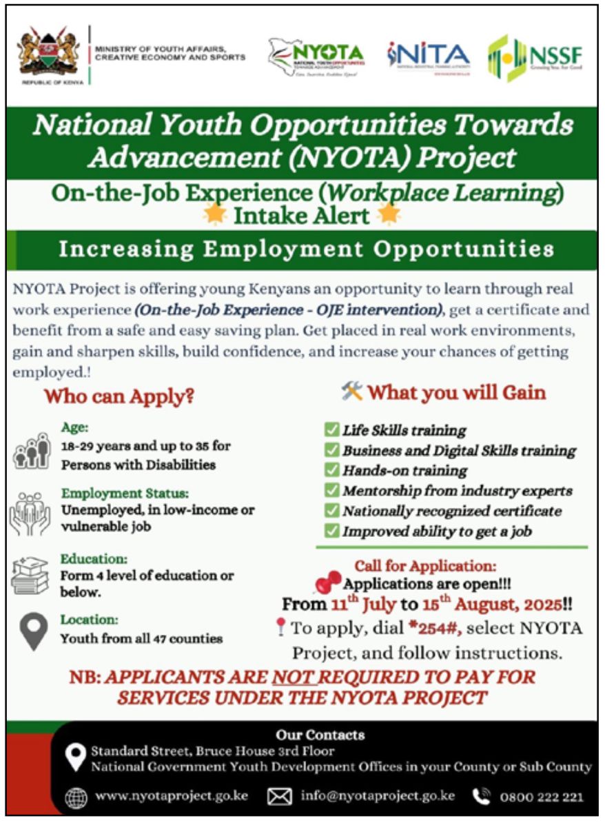 Interested youth are encouraged to apply by dialing *254#, selecting the NYOTA Project option, and following the instructions.