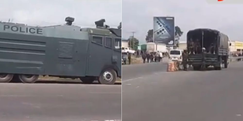 Photos from the scene show extensive security arrangements with armored personnel carriers, water cannons, and heavily armed officers taking positions around JKIA.