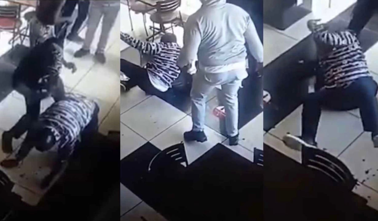 A staff member is seen attempting to intervene and stop the attack, but he is warned by one of the attackers, forcing him to back away.