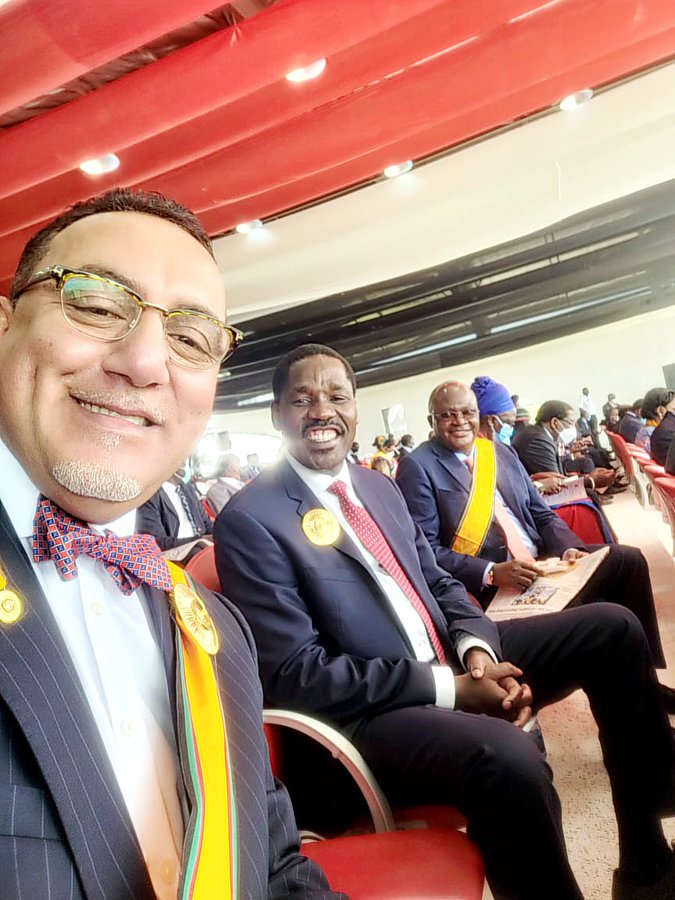 The Head of State is dressed in the red tunic ceremonial gear for the Commander in Chief of Defense Forces.